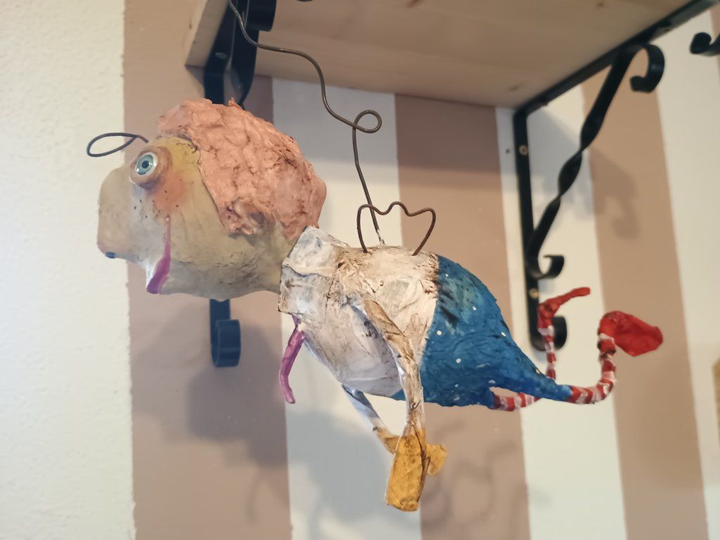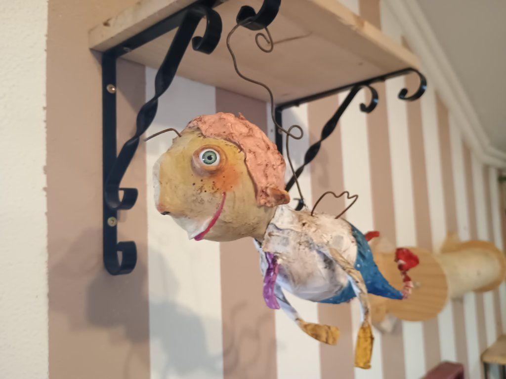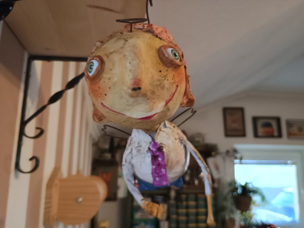 Anjelik je vyrobený technikou paper mache. Je maľovaný, patinovaný a následne ošetrený voskom, aby sa dal udržiavať. Dá sa kamkoľvek zavesiť.