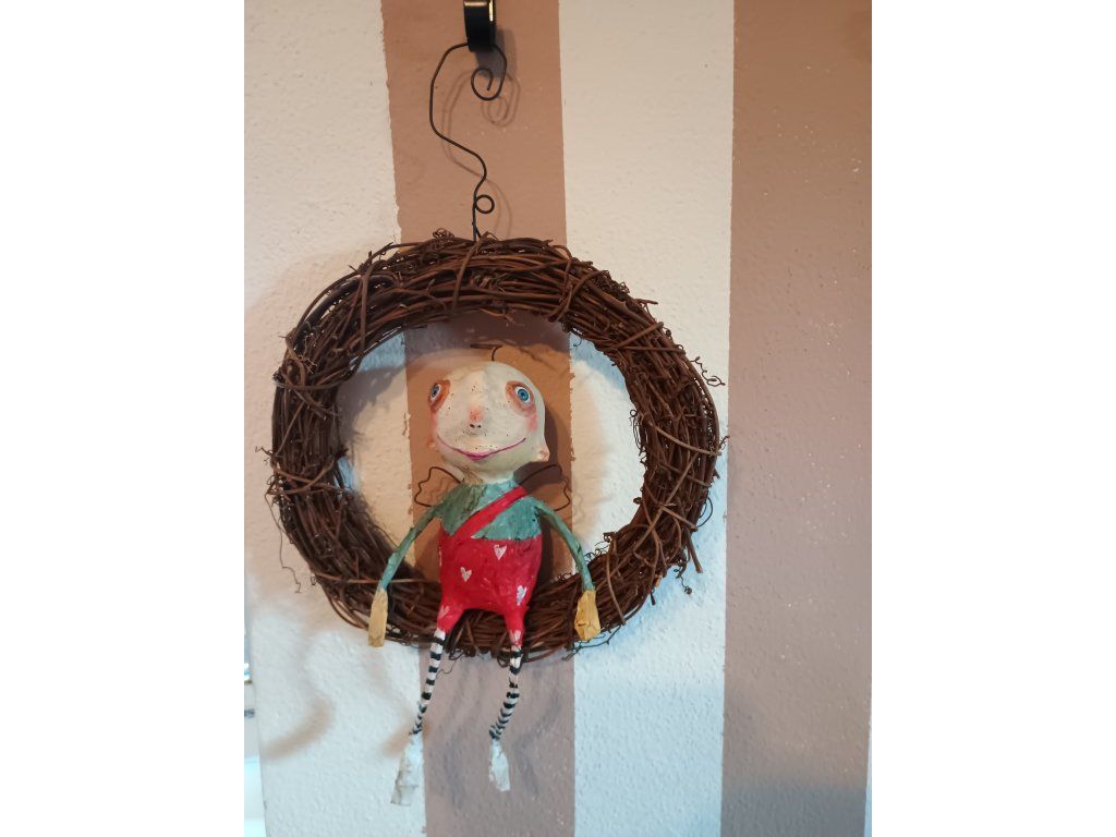 Anjelik je robený technikou paper mache, maľovaný a na záver voskovaný pre lepšie udržiavanie. Sedí v prútenom venčeku, ktorý sa dá zavesiť vďaka drôtiku.