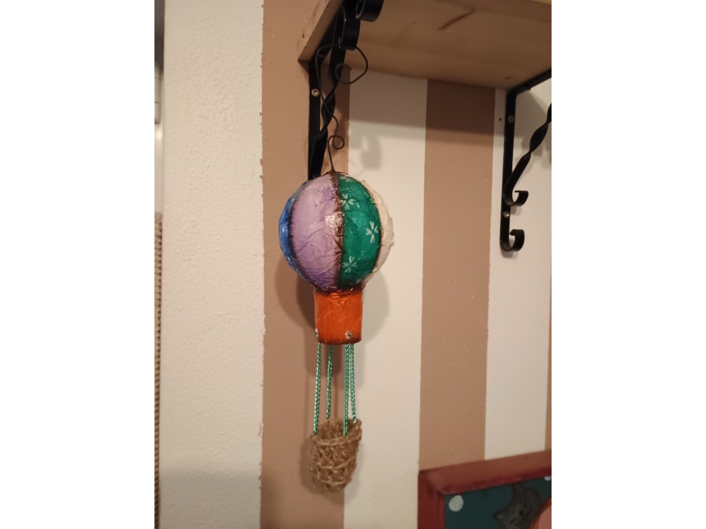 Balón je vyrobený technikou paper mache, doplnený háčkovaným košíkom. Balón má pripevnený drôt na zavesenie.