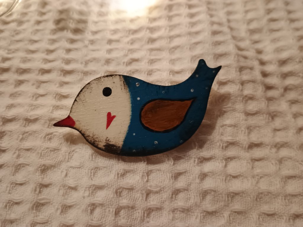 Brošňa je vyrobená z dyhy, preto je veľmi ľahká a skvelo sa nosí na čomkoľvek. Je maľovaná, patinovaná a následne lakovaná.