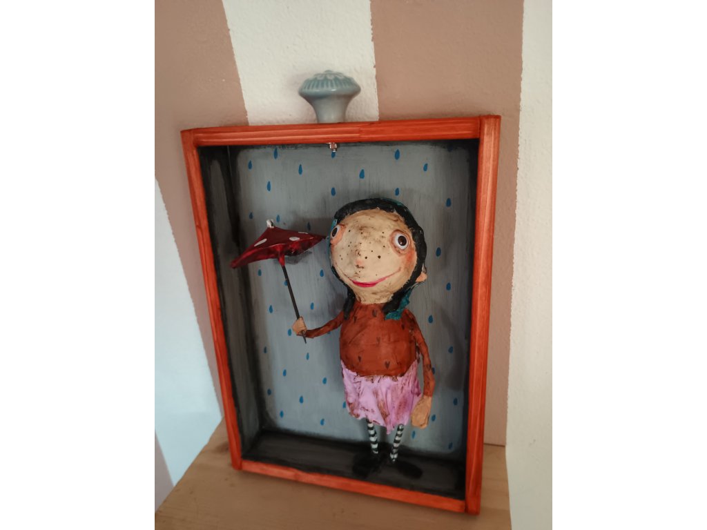 Postava je vyrobená technikou paper mache, následne je obraz maľovaný, patinovaný a na záver voskovaný, aby sa dal dobre udržiavať.