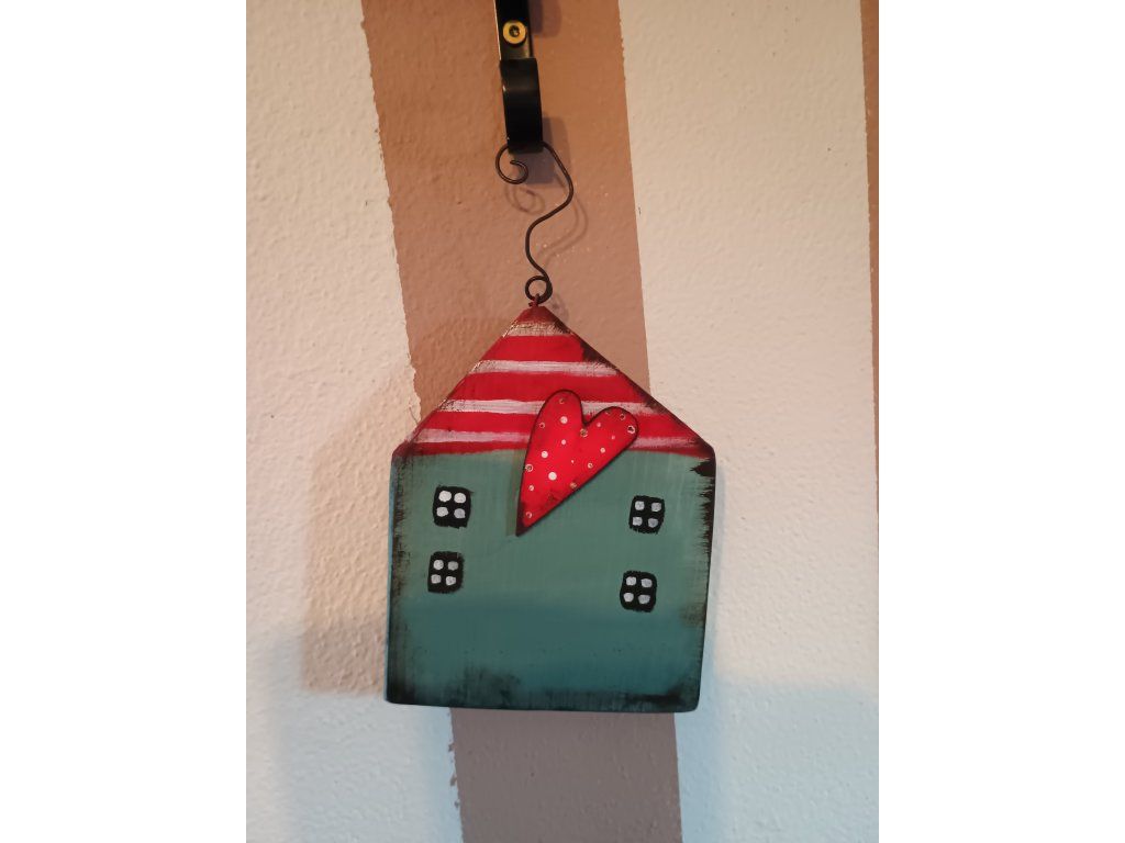 Domček je vyrezaný z dreva, maľovaný, patinovaný  a na záver voskovaný. Má drôtik na zavesenie.