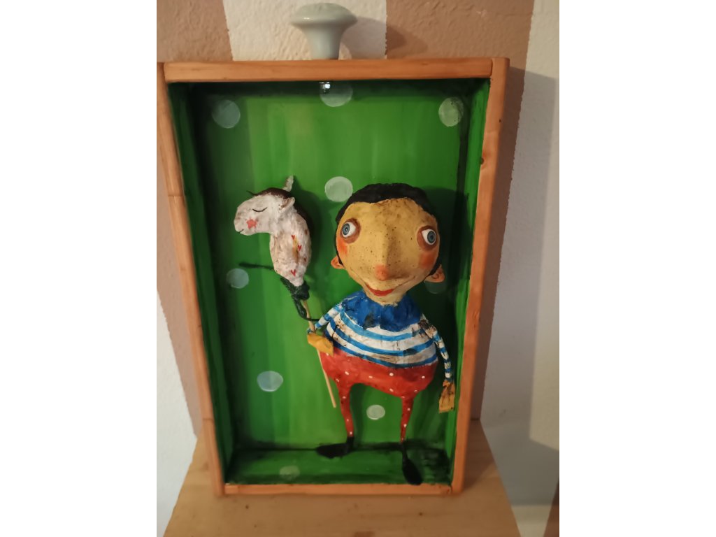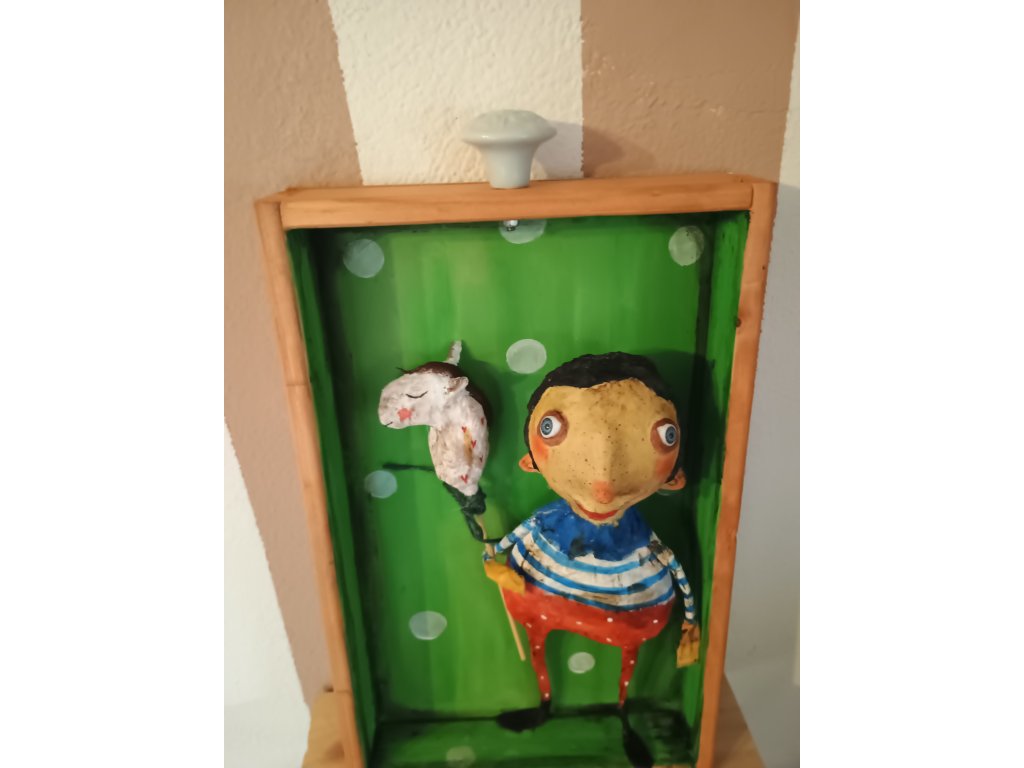 Chlapček z papiera (vyrobený technikou paper mache) sa volá Emil. Rád sa hraje a je stále veselý. Býva v drevenom šuflíku, ktorý sa dá zavesiť, takže vám Emil môže robiť radosť každý deň, keď ho uvidíte.
