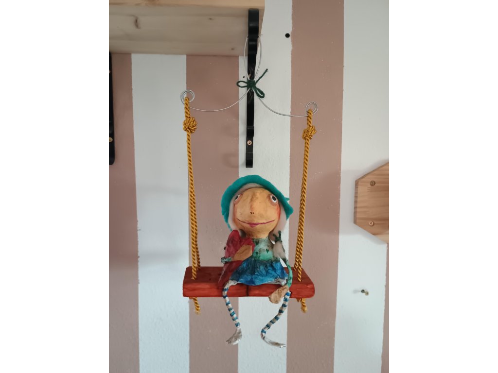 Lucka je vyrobená technikou paper mache. Veselo sa pohupuje na hojdačke a dá sa kamkoľvek zavesiť, aby vám mohla robiť radosť. Či už do priestoru alebo na stenu ako obraz.
