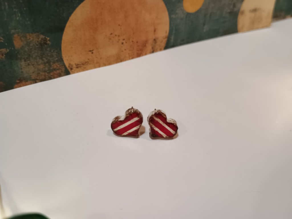 Náušničky sú vyrobené z hmoty schnúcej na vzduchu. Sú maľované, patinované, lakované.
