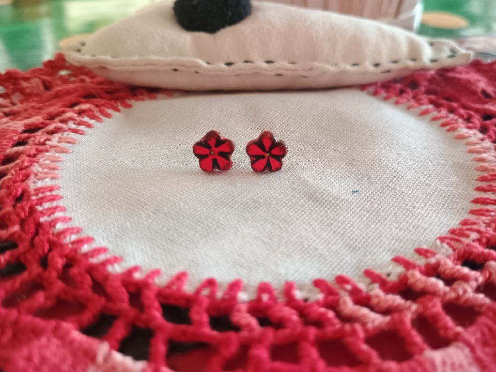 Náušnice sú modelované z hmoty schnúcej na vzduchu, farbené, patinované a lakované. Komponenty sú z chirurgickej ocele.