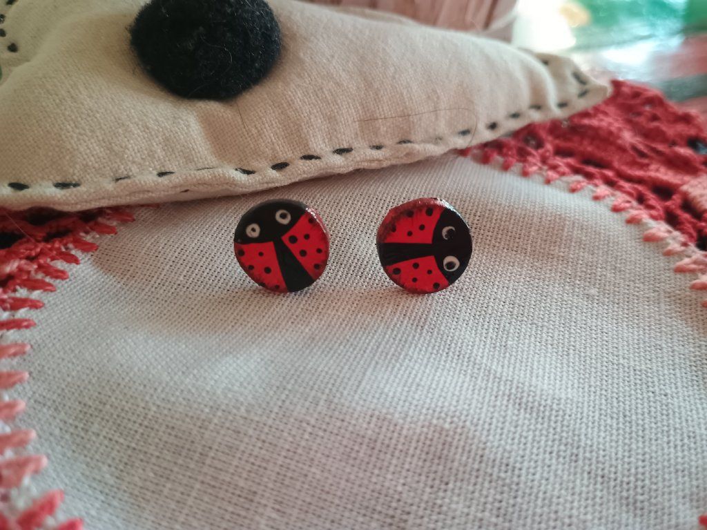 Náušničky sú vyrobené z hmoty schnúcej na vzduchu. Sú maľované, patinované, lakované. Komponenty sú z chirurgickej ocele.