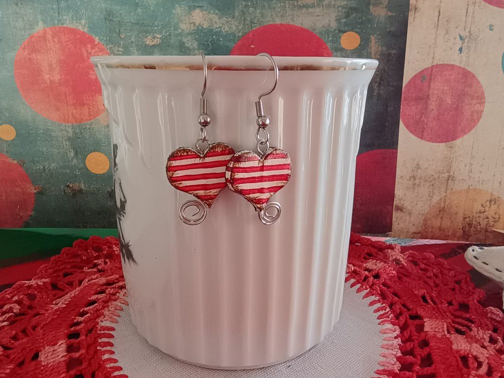 Náušnice sú modelované z hmoty schnúcej na vzduchu, farbené, patinované a lakované. Komponenty sú z chirurgickej ocele.