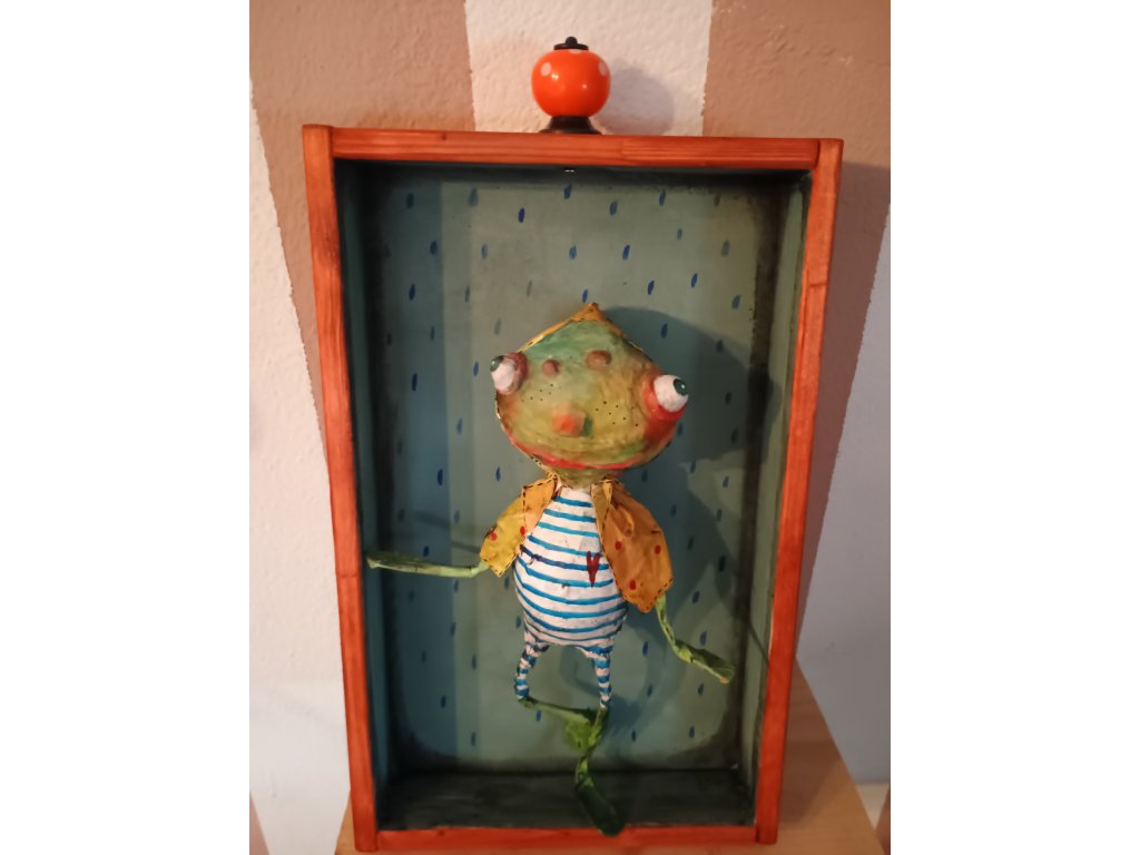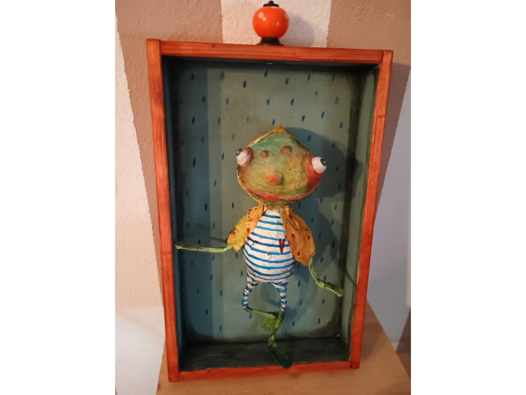 Žabiak je vyrobený technikou paper mache. Je maľovaný a voskovaný, aby sa dobre udržiaval. Šuflík je z dreva, taktiež ručne robený.